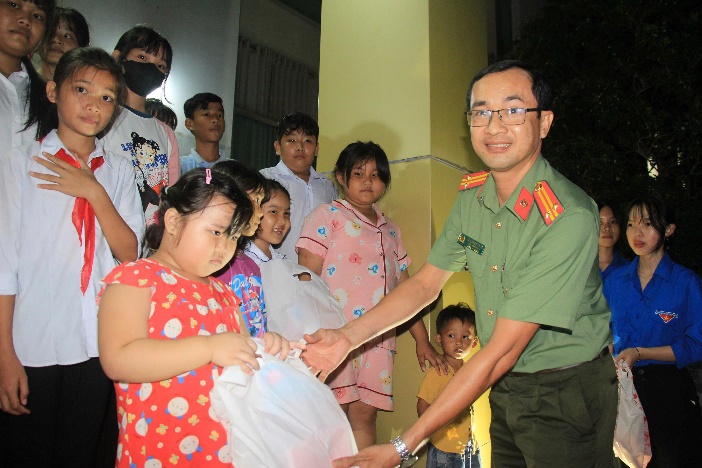 Trung tá Lê Quang Toàn, Phó Trưởng Công an phường tặng quà trung thu cho thiếu nhi có hoàn cảnh khó khăn trên địa bàn phường