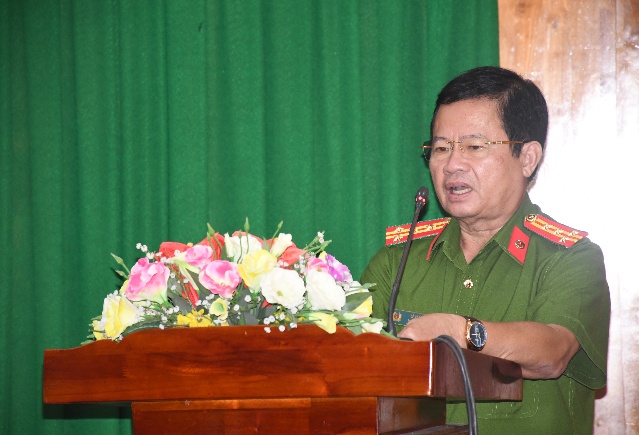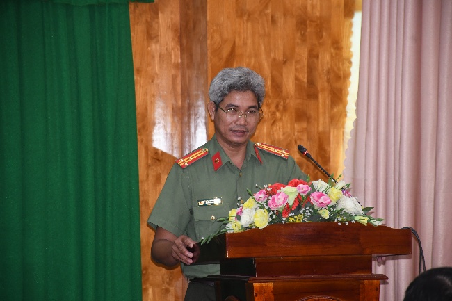 Đại tá Phan Ngọc Tính, Phó Giám đốc Công an tỉnh và Đại tá Lê Văn Tư, Phó Giám đốc Công an tỉnh phát biểu tại hội nghị