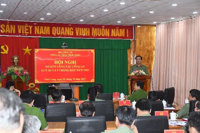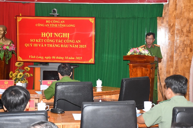 Ngày 06/10/2025, Công an tỉnh Vĩnh Long tổ chức hội nghị sơ kết công tác Công an quý III và 09 tháng đầu năm 2025. Dự và chỉ đạo hội nghị có đồng chí Thiếu tướng Nguyễn Thanh Hải, Ủy viên Ban Thường vụ Tỉnh ủy, Giám đốc Công an tỉnh. Tham dự có các đồng chí trong Ban Giám đốc Công an tỉnh; Trưởng các đơn vị nghiệp vụ trực thuộc, Trưởng Công an xã, phường trên địa bàn tỉnh. Hội nghị được tổ chức trực tiếp và kết nối trực tuyến đến 02 điểm cầu khu vực Trà Vinh, Bến Tre.